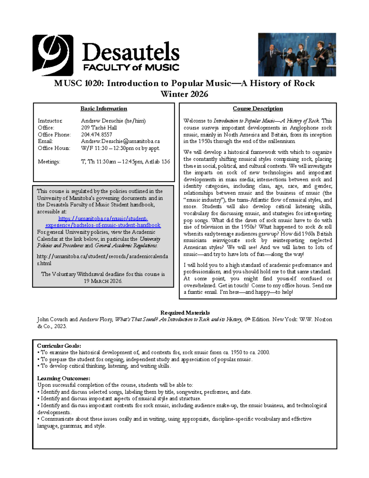 MUSC 1020: Syllabus for Introduction to Popular History of Rock Winter ...