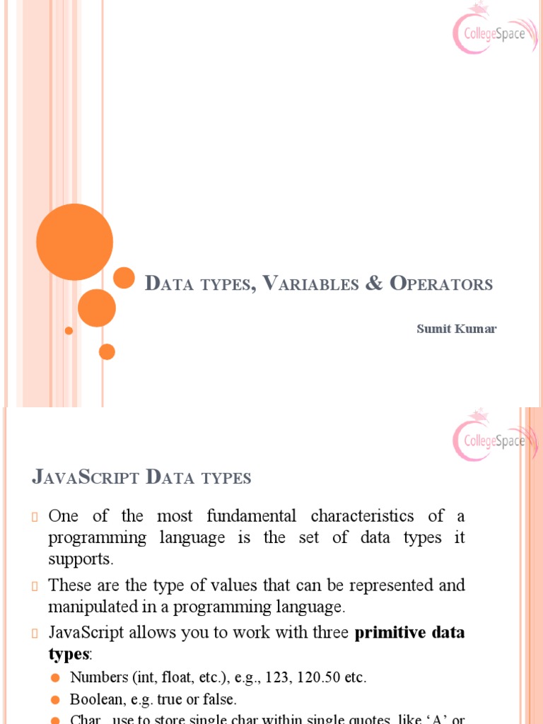 Based on this image's title: “JS Data Types, Variables & Operators | PDF | Data Type | Variable ...”
