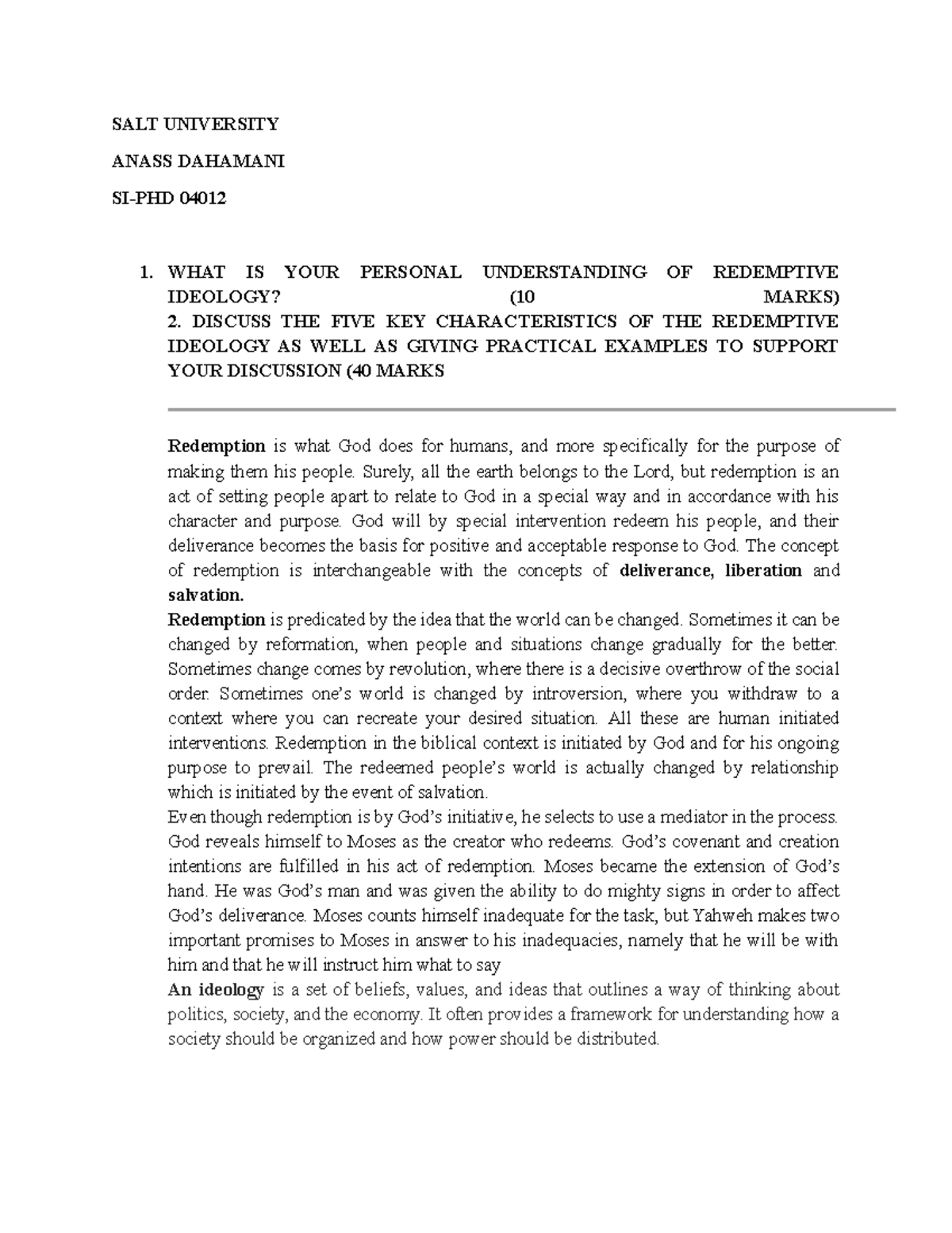 SALT UNIVERSITY 04012 Redemptive Ideology Assignment Analysis - Studocu