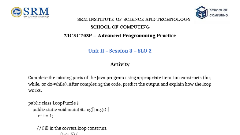 21CSC203P Advanced Programming Practice: Loop Constructs & Output - Studocu