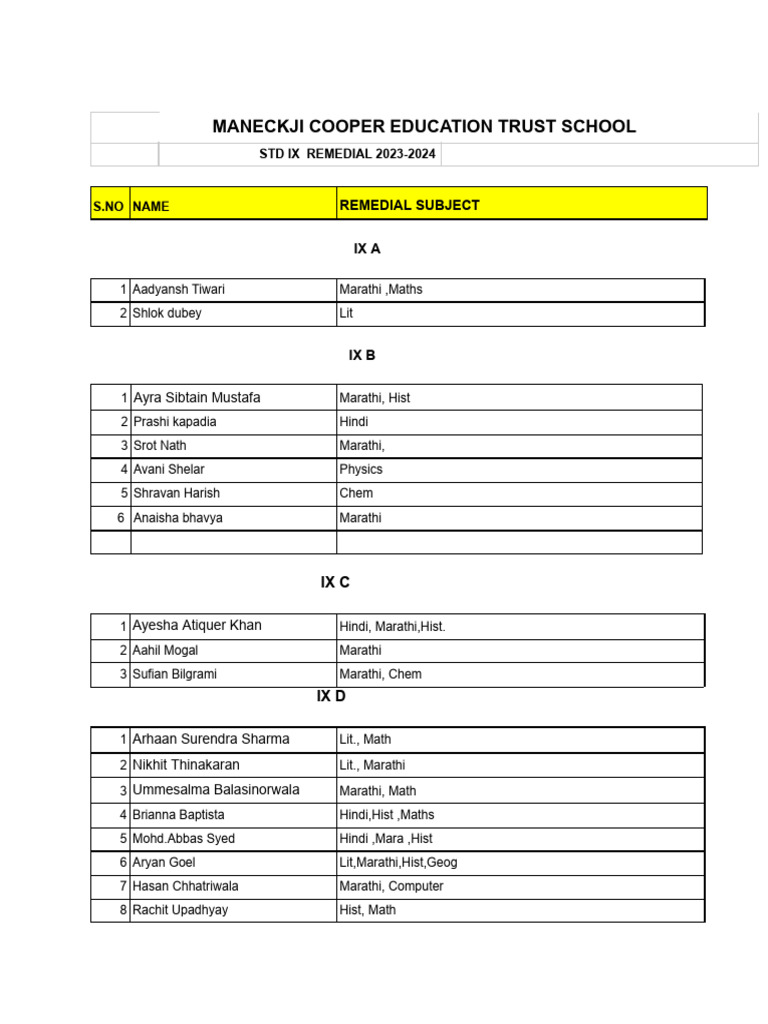 IX Remedial Subjects List 2023-2024 | PDF