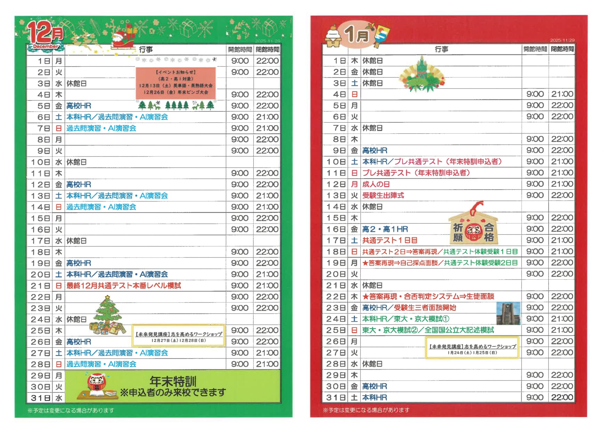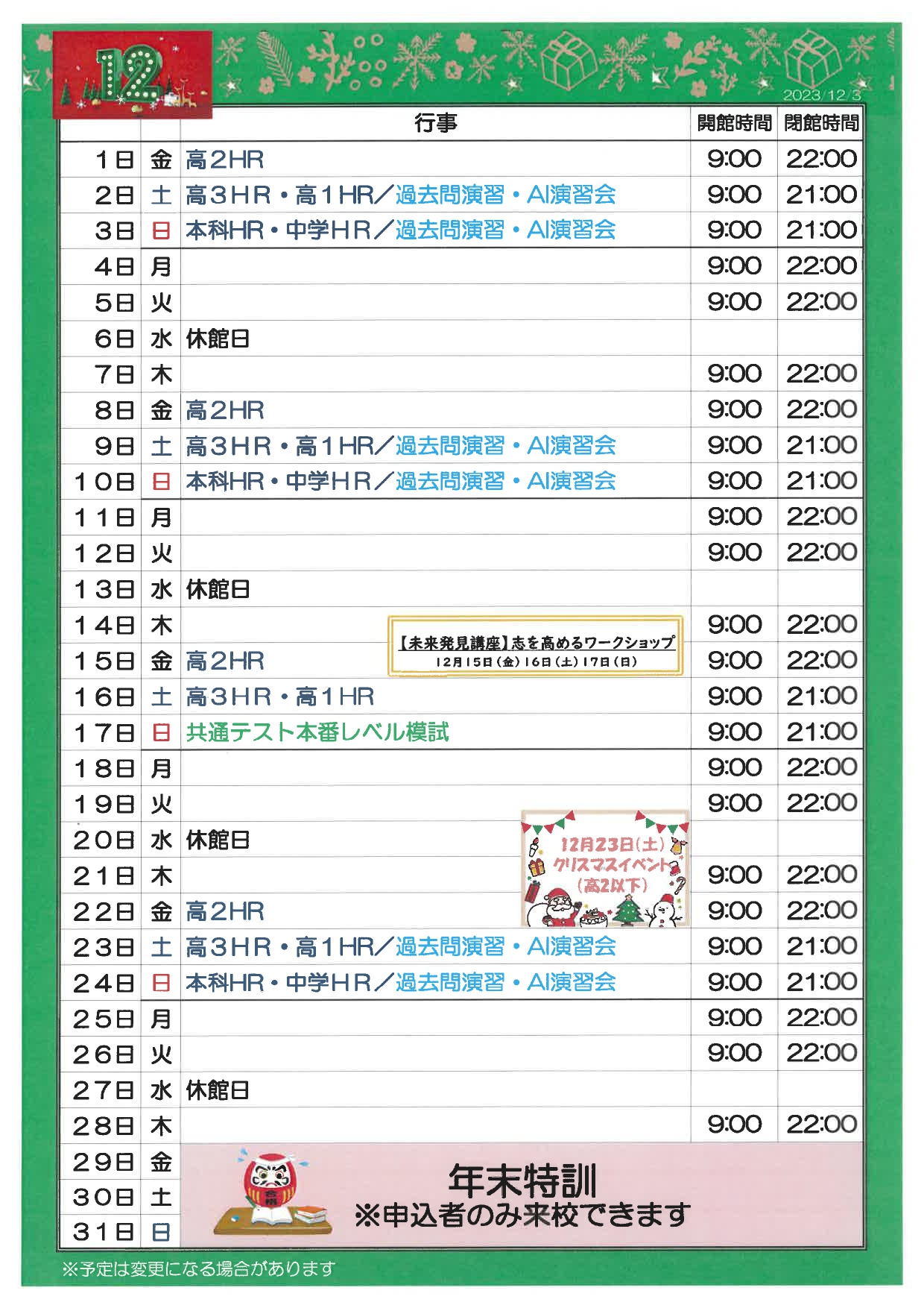校舎スケジュール12月&1月版 – 東進衛星予備校 大牟田有明町校/大牟田の大学受験予備校・学習塾