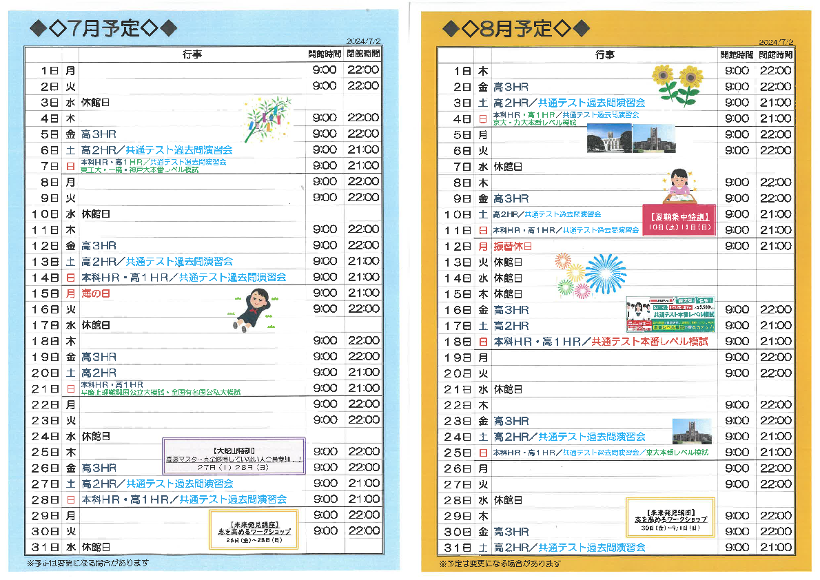 校舎スケジュール 7月・8月版 – 東進衛星予備校 大牟田有明町校/大牟田の大学受験予備校・学習塾