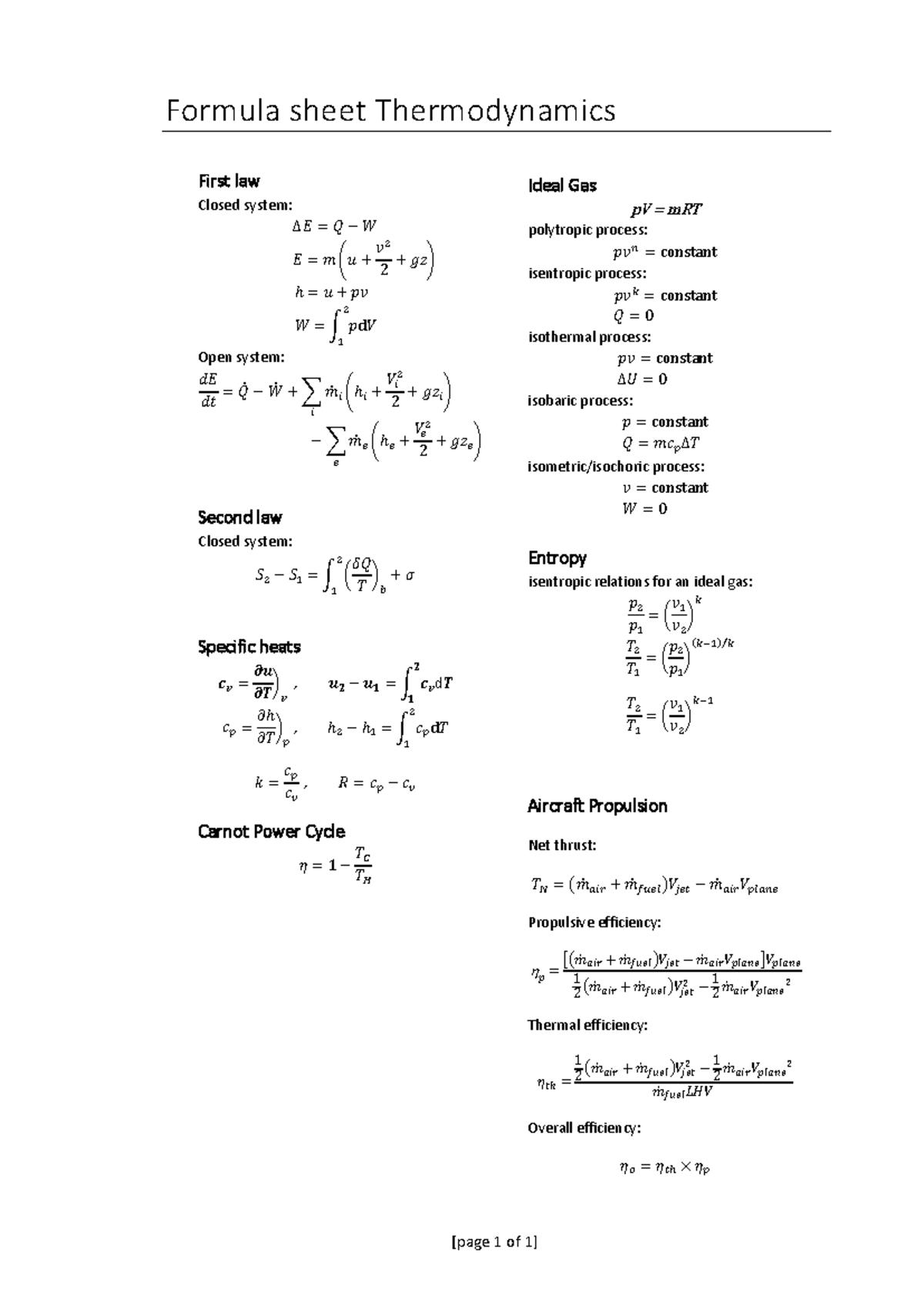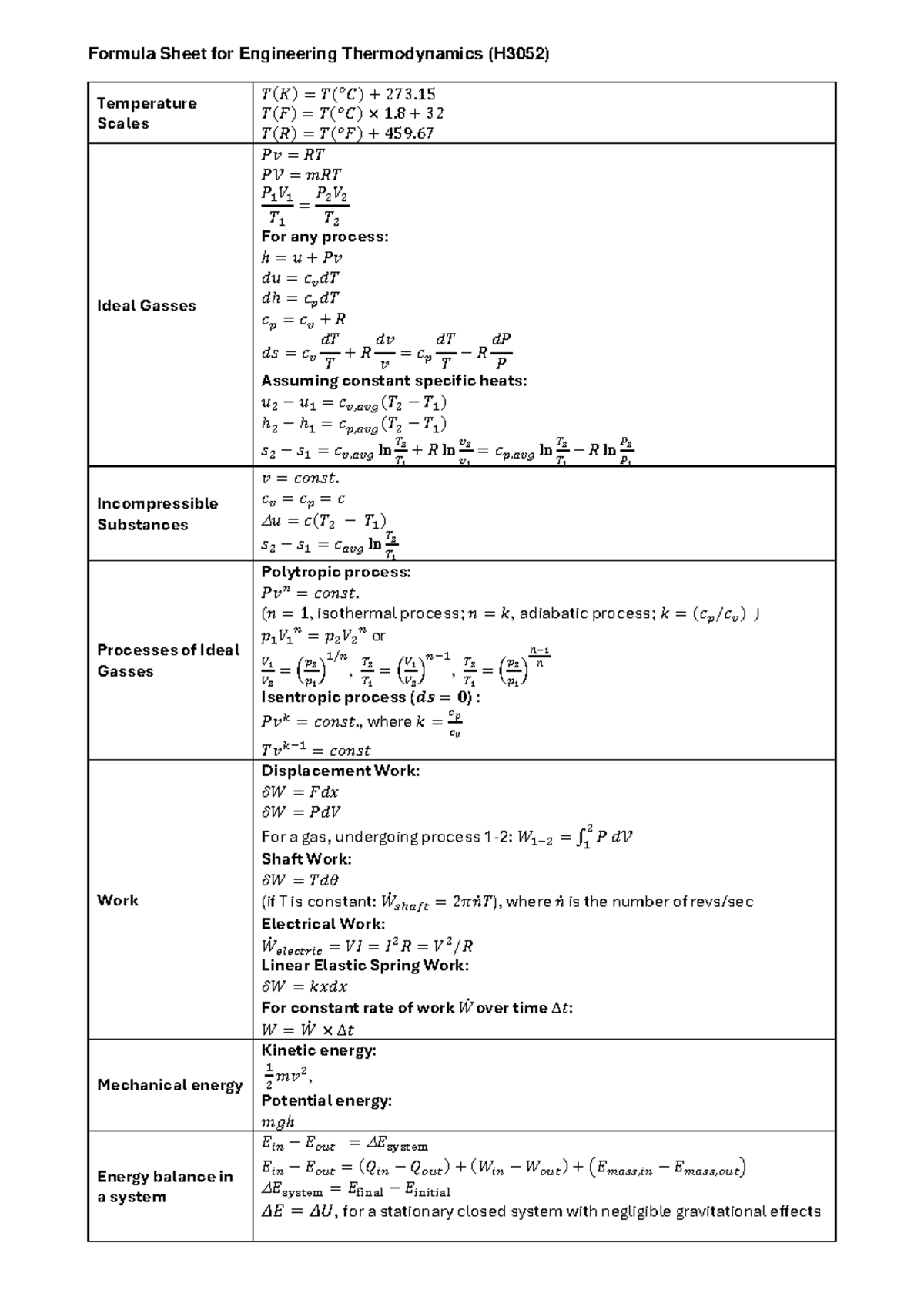 Formula Sheet for Engineering Thermodynamics (H3052) - Key Equations ...