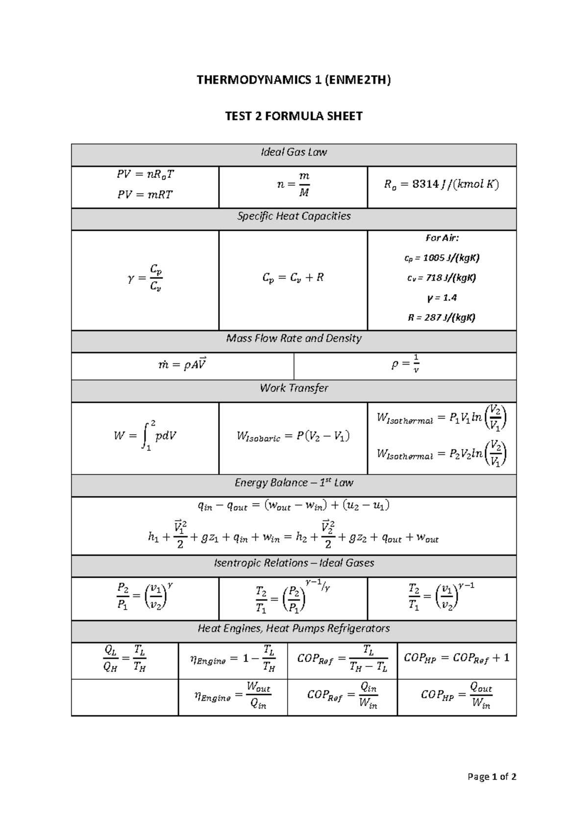 2018 - ENME2TH - Test 2 - Thermodynamics Formula Sheet - Studocu