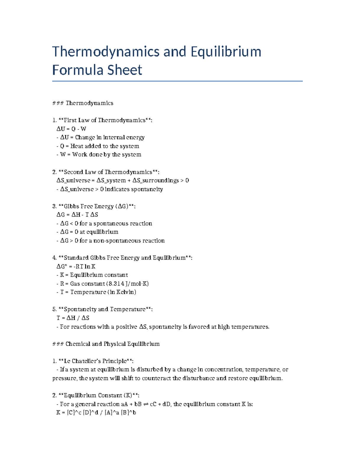 Thermodynamics formula sheet r - Thermodynamics and Equilibrium Formula ...