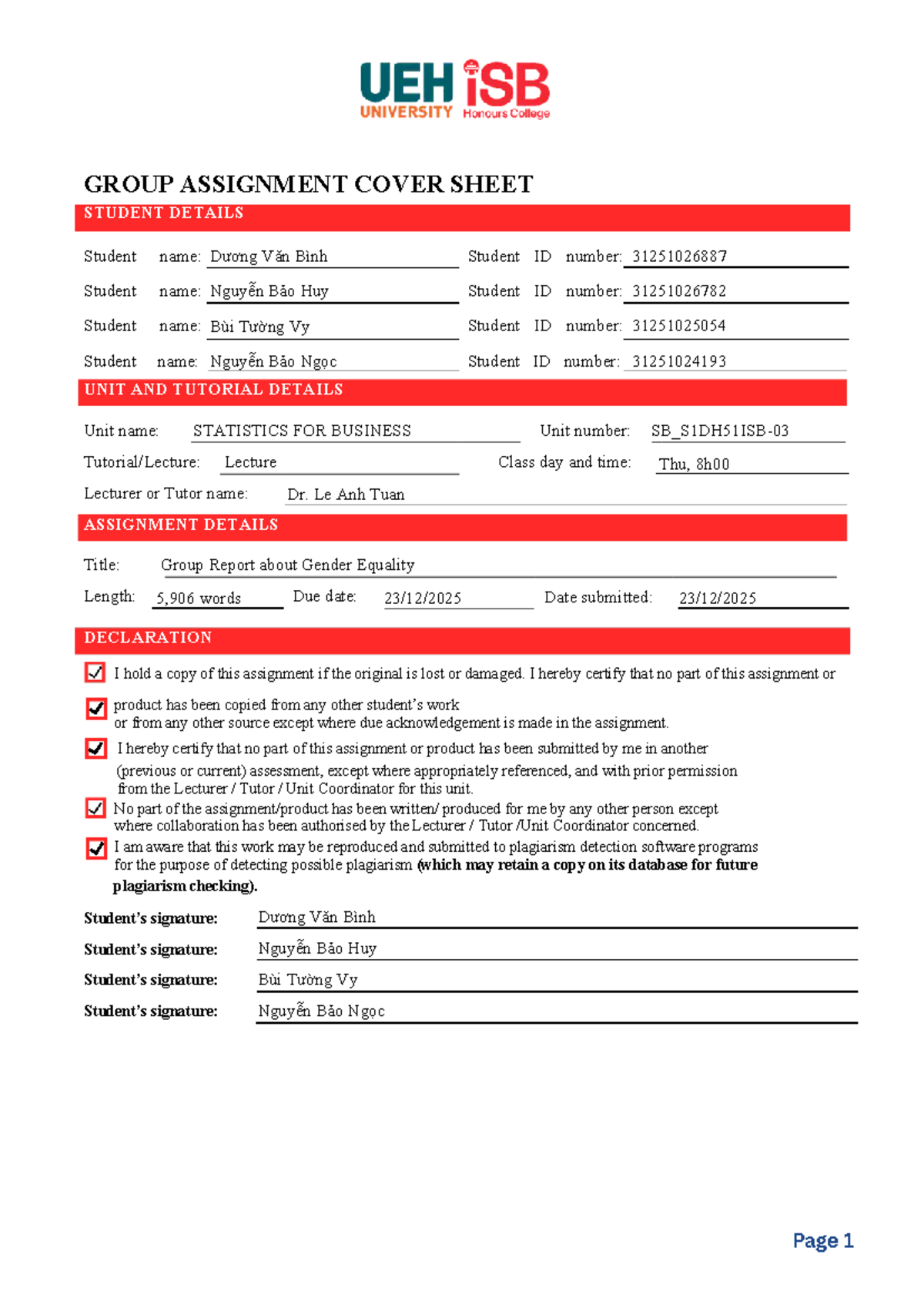 SB3 Group Report on Gender Equality in Business Statistics - Studocu