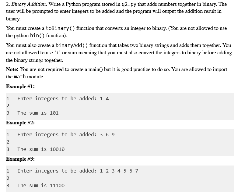 Solved 2. Binary Addition. Write a Python program stored in | Chegg.com