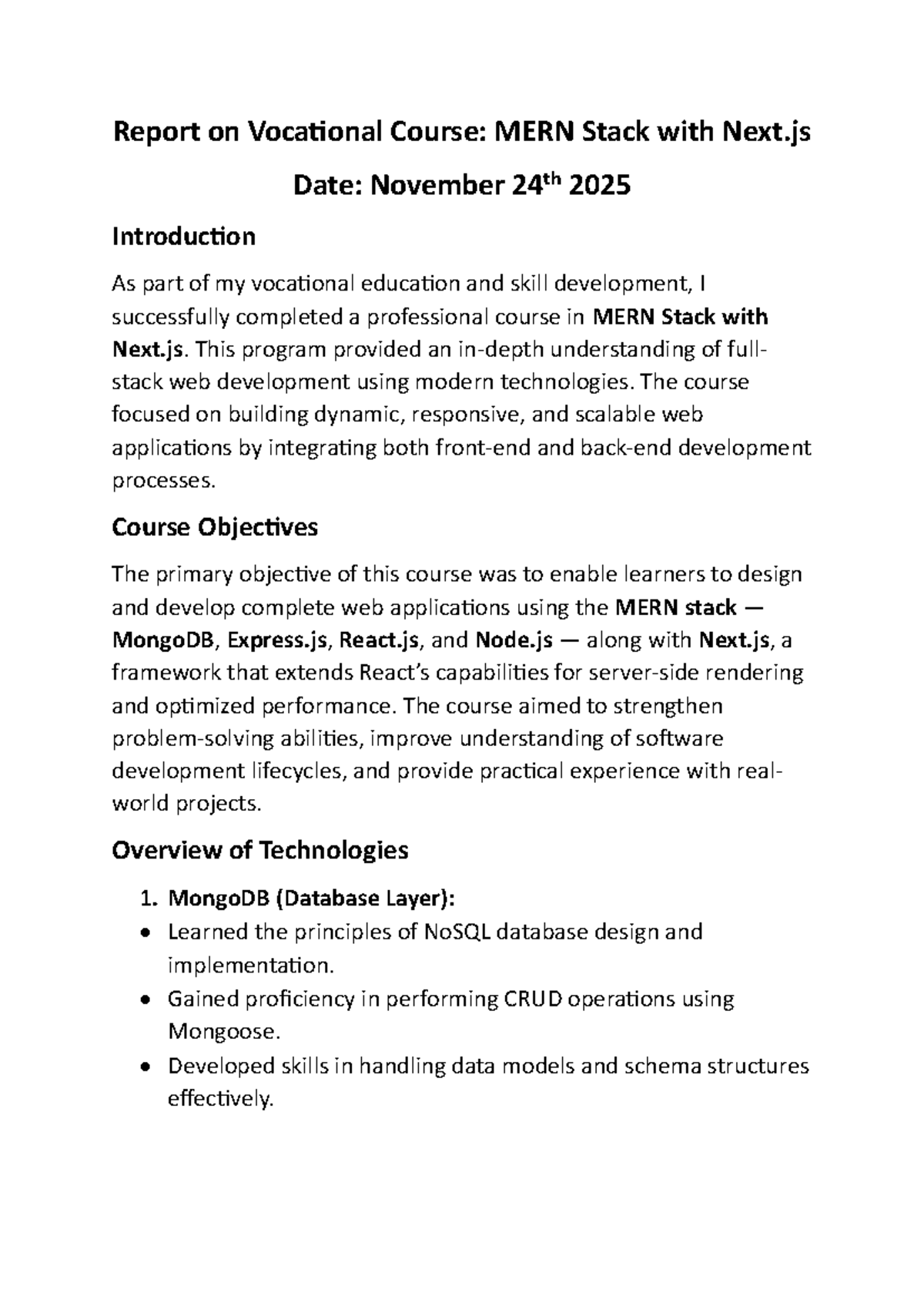 MERN Stack Vocational Course Report: Skills & Technologies Overview ...