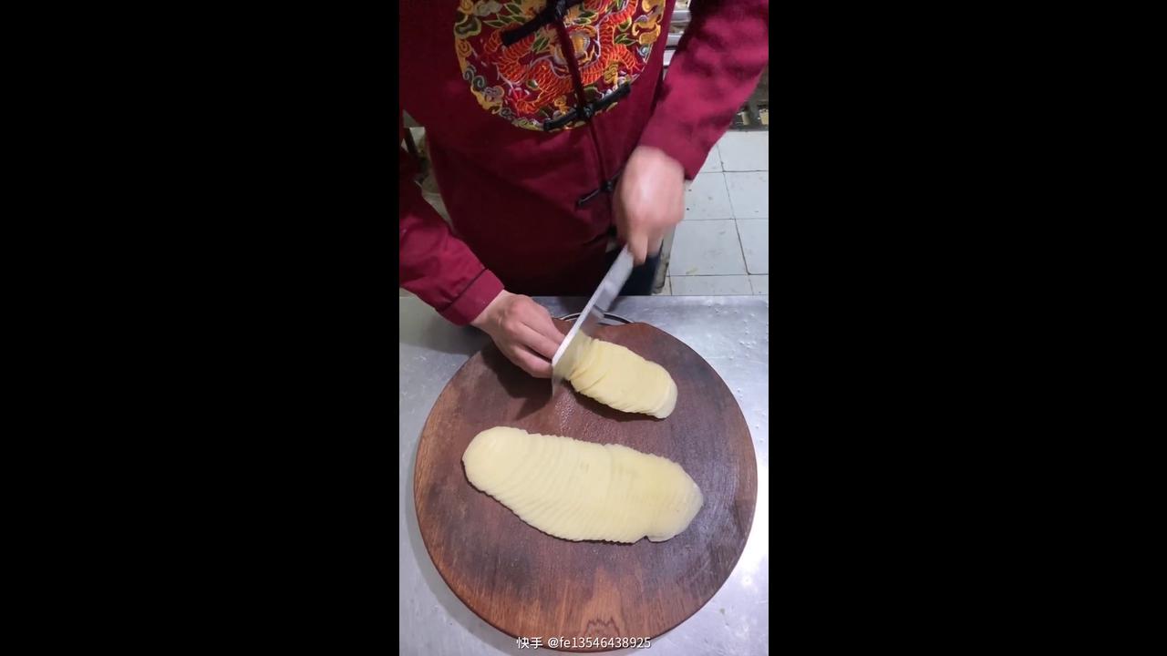 Slicing potato into thin even pieces with sharp knife on wooden board ...