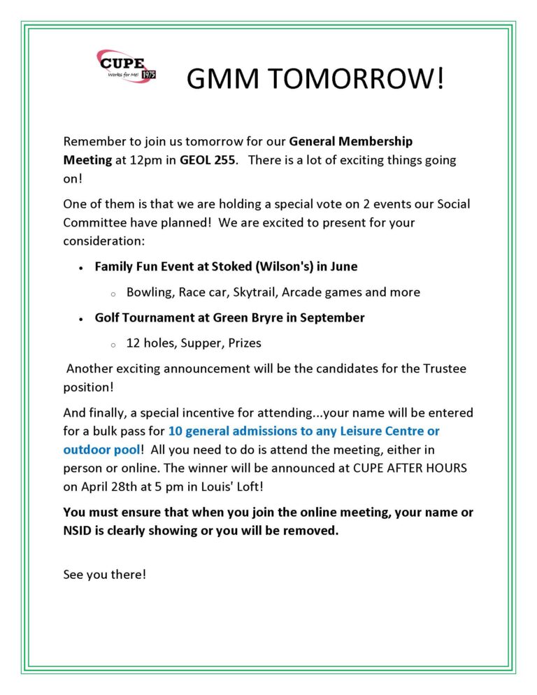 GMM Tomorrow at 12 pm in GEOL 255 - CUPE 1975