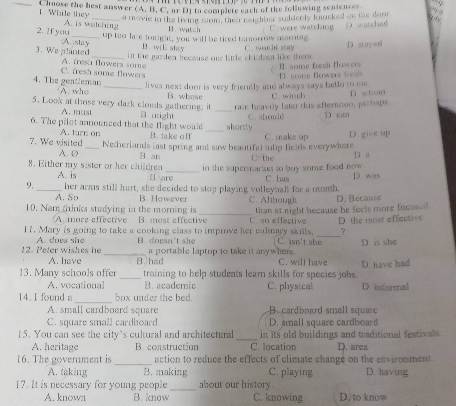 Giải quyết:Choose the best answer (A, B, C, or D) to complete each of ...
