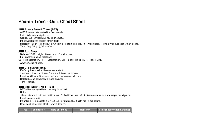 Search Trees Quiz Cheat Sheet: BST, AVL, and RBT Overview - Studocu
