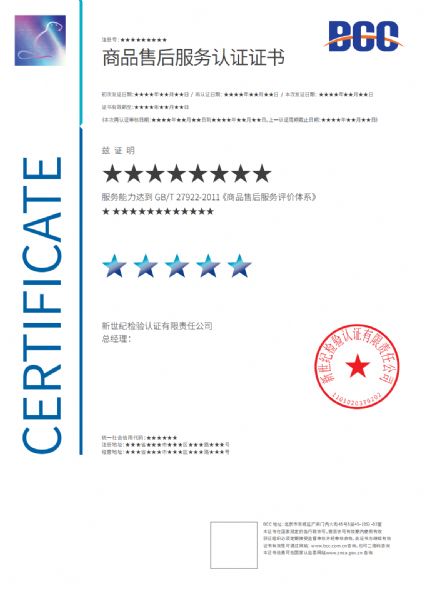 商品售后服务完善度认证证书GB/T27922-2011 产品关键词:具有gb/t27922-2011售后服务认证证书;售后服务认证(gb ...