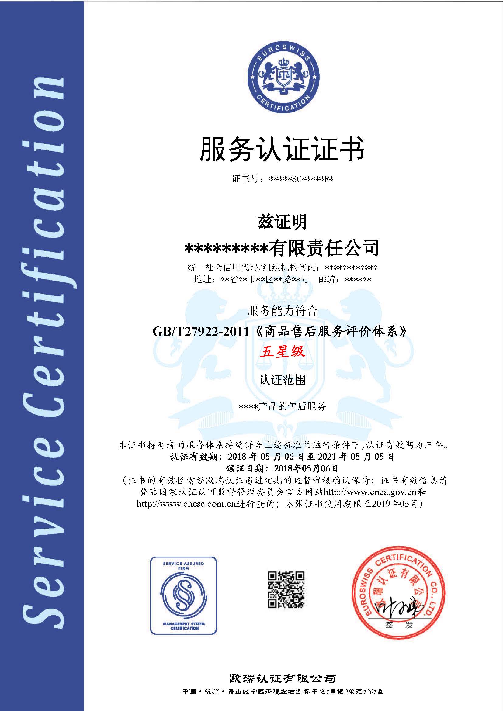 GB/T27922-2011五星商品售后服务认证证书办理