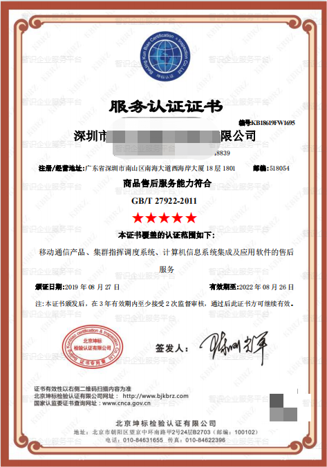 GB/T27922 商品售后服务认证-深圳坚祥科技有限公司