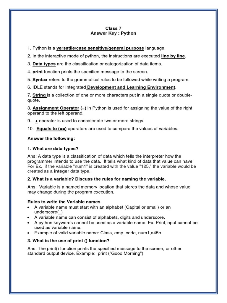 Answer Key Python Class 7 | PDF | Variable (Computer Science ...