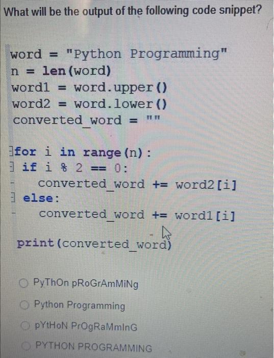 Based on this image's title: “What will be the output of the following code snippet? python word = "Pyt..”