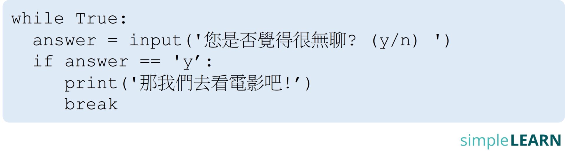 Based on this image's title: “Python for Beginners (14)|迴圈控制 - while loops - SimpleLearn”
