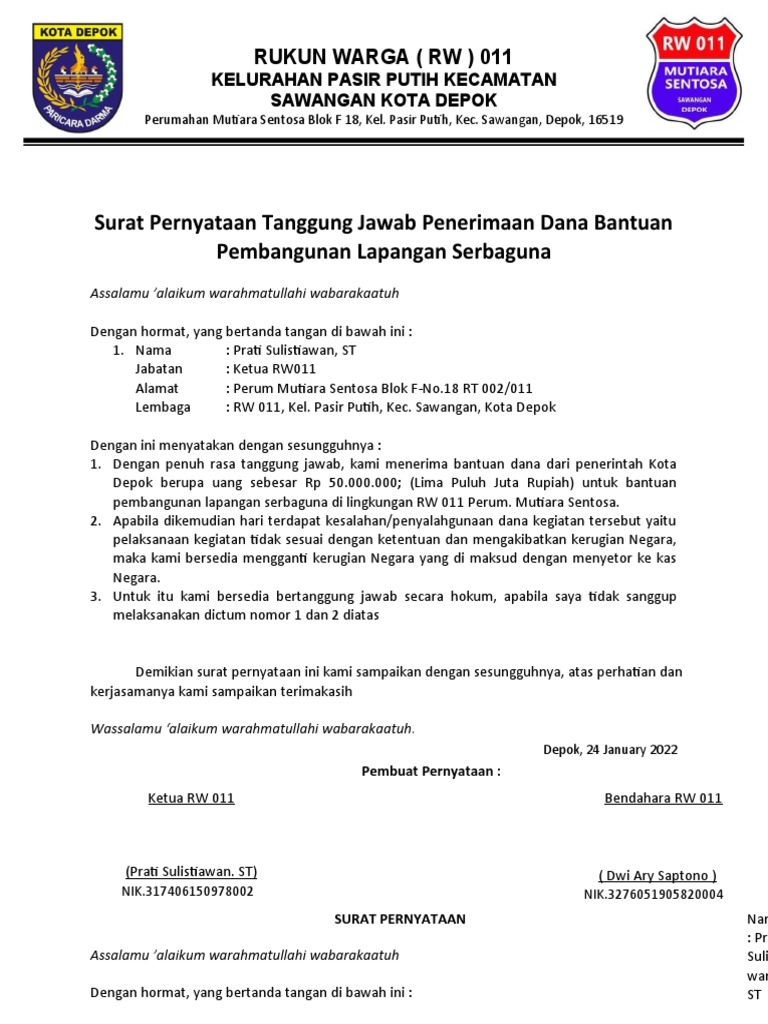 Surat Pernyataan Dana Hibah RW 011 | PDF