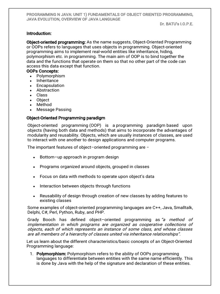 Java unit-1 - Name - UNIT 1 Introduction to OOP Introduction to Object ...