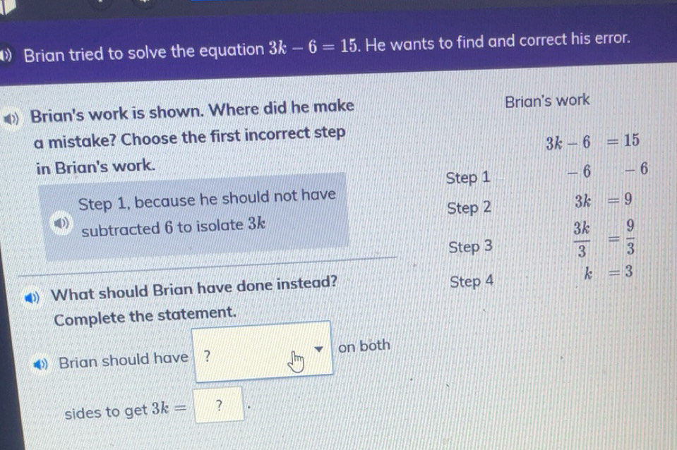 Solved: 》 Brian tried to solve the equation 3k-6=15. He wants to find ...