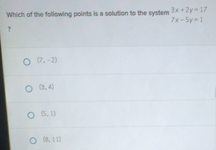 Solved: Which of the following points is a solution to the system 3x+2y ...
