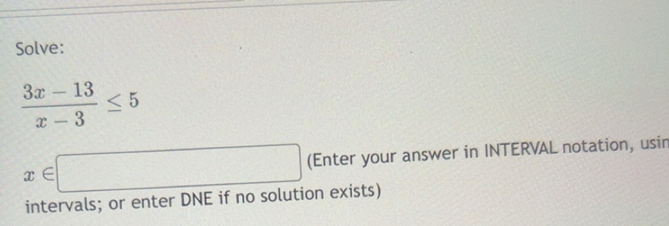 Solved: Solve: (3x-13)/x-3 ≤ 5 x∈ (Enter your answer in INTERVAL ...