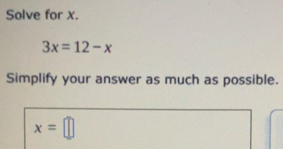 Solved: Solve for x. 3x=12-x Simplify your answer as much as possible ...