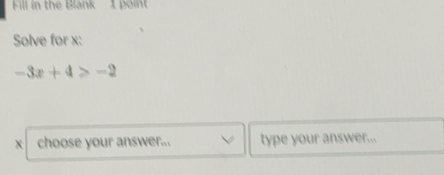 Solved: Fill in the Blank I point Solve for x : -3x+4>-2 x choose your ...