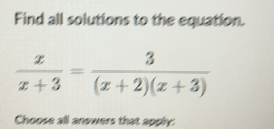Solved: Find all solutions to the equation. x/x+3 = 3/(x+2)(x+3) Choose ...