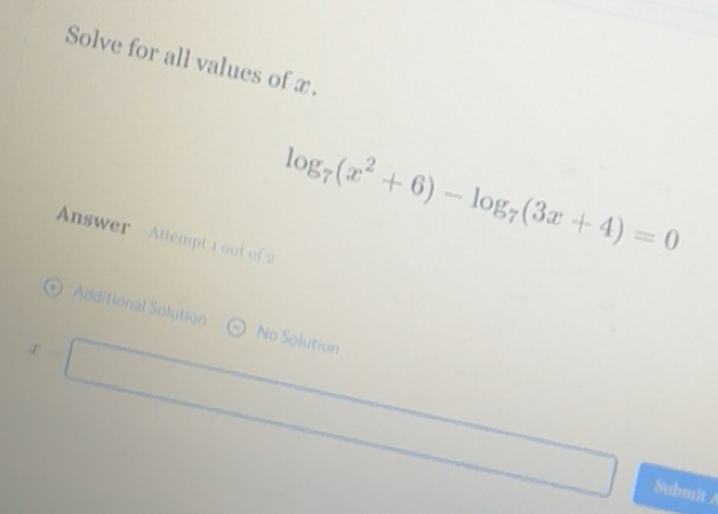 Solved: Solve for all values of æ. Answer Attempt 1 out of2 log _7(x^2 ...
