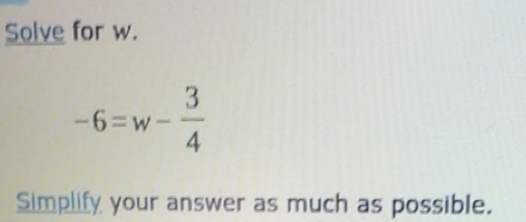 Solved: Solve for w. -6=w- 3/4 Simplify your answer as much as possible ...