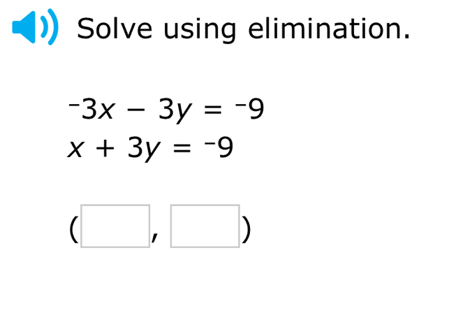 Solved: Solve using elimination. -3x-3y=-9 x+3y=-9 ( , ) [Math]