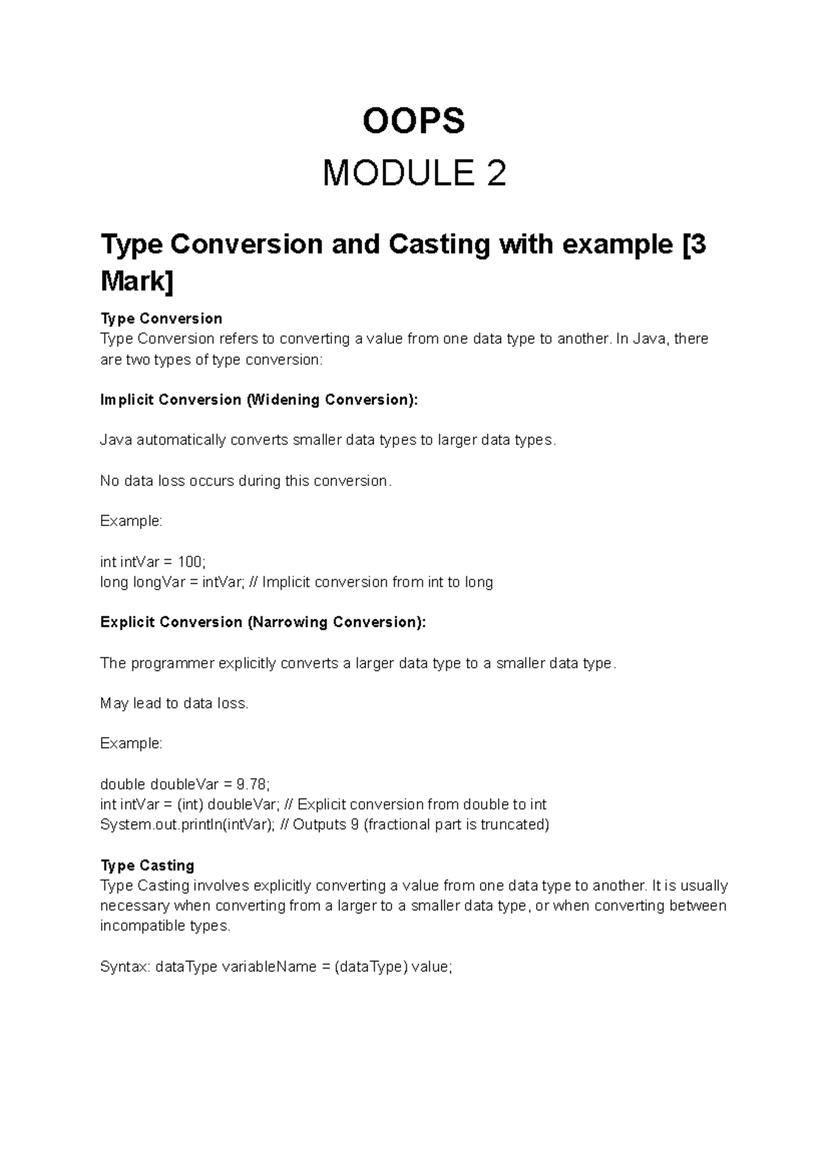 OOPS Module 2: Type Conversion, Casting, Data Types & Operators - Studocu