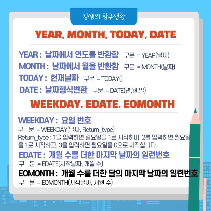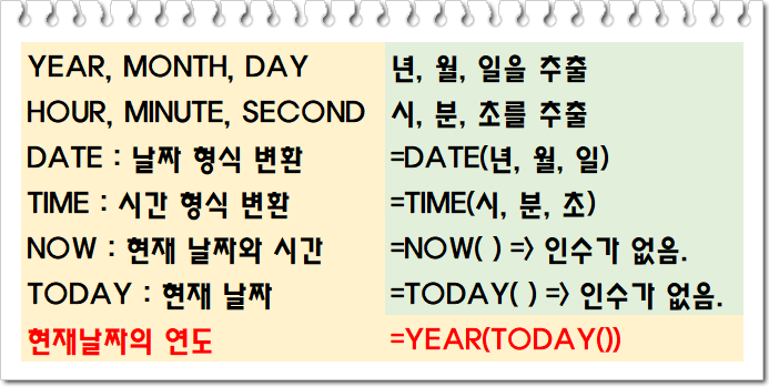 엑셀 날짜 함수. 날짜, 시간 관련 함수 정리 (TODAY, DATE, TIME 등) : 네이버 블로그
