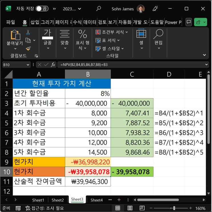 {엑셀} NPV 함수 - 투자의 현재 가치 : 네이버 블로그