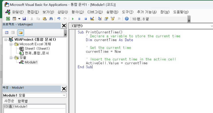 [챗GPT] 현재시간 출력. 엑셀 VBA 코드 : 네이버 블로그