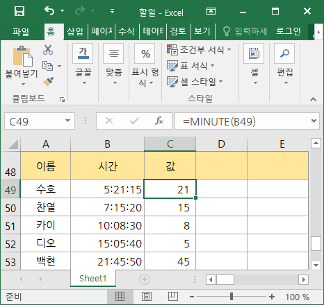 엑셀시간함수 TIME, HOUR, MINUTE 활용해서 계산해보기 : 네이버 블로그