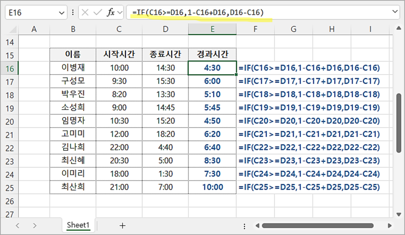 2개의 엑셀 시간 사이의 경과 시간이나 소요 시간을 계산하려면 (엑셀 IF 함수, 엑셀 MOD 함수) : 네이버 블로그