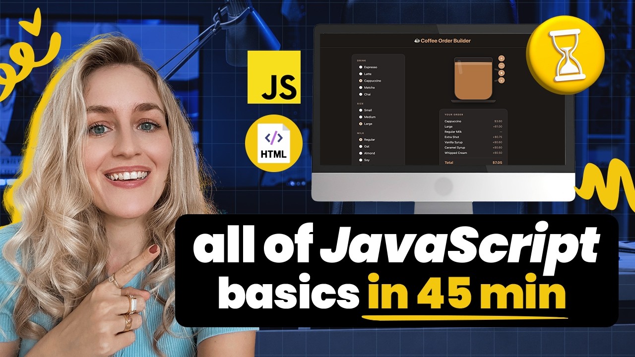 Based on this image's title: “Learn All JavaScript Basics in Under 45 Minutes (HTML + CSS + Vanilla ...”