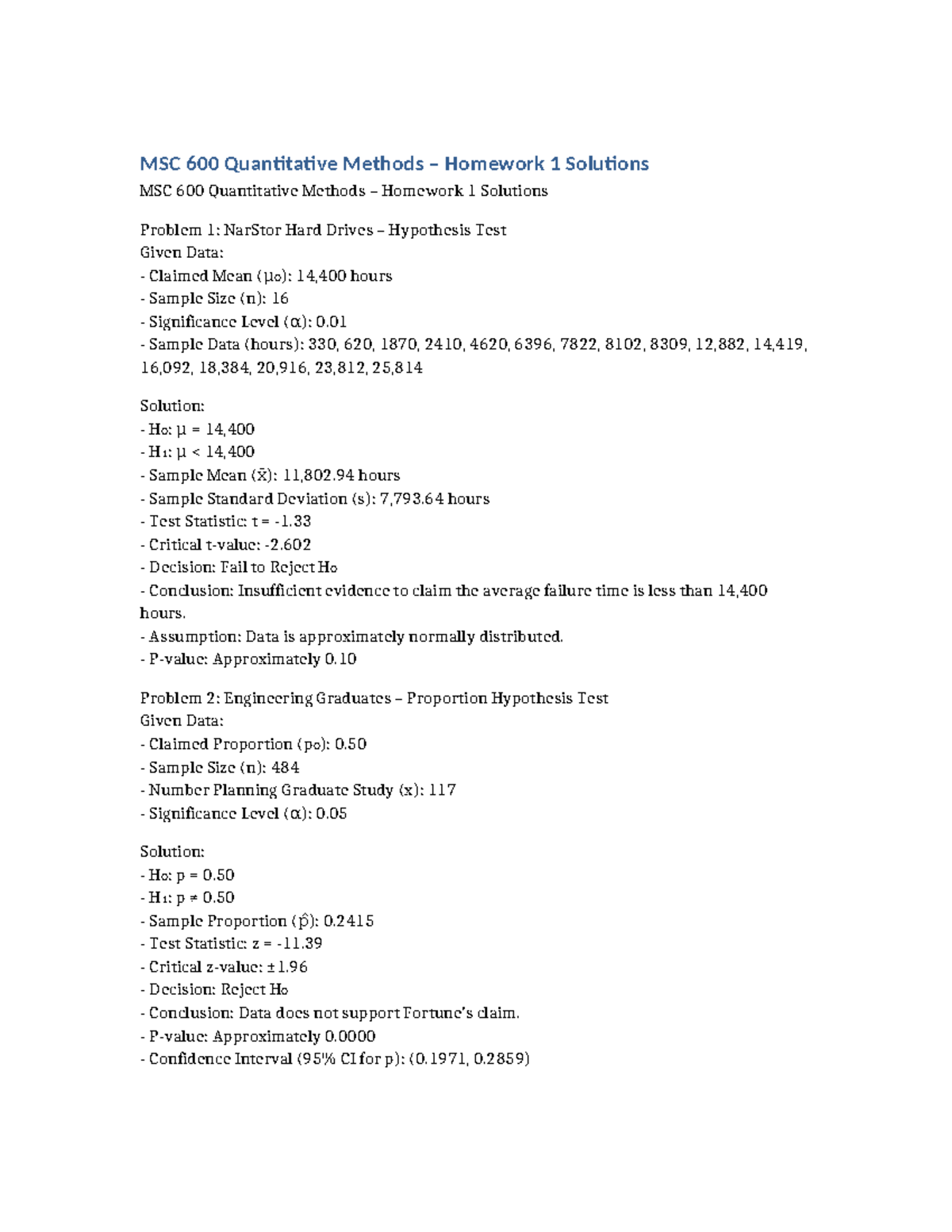 MSC 600 Quantitative Methods Homework 1 Solutions Analysis - Studocu