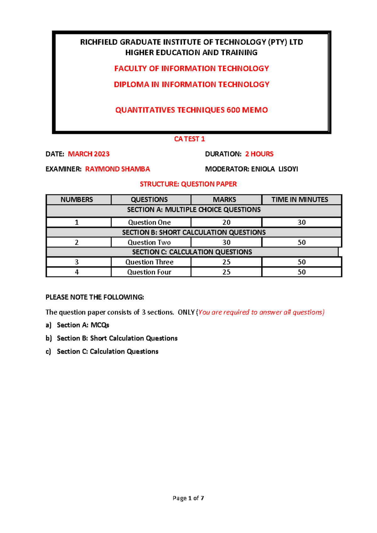 Quantitative Techniques 600 CA Test 1 Examination Paper March 2023 ...