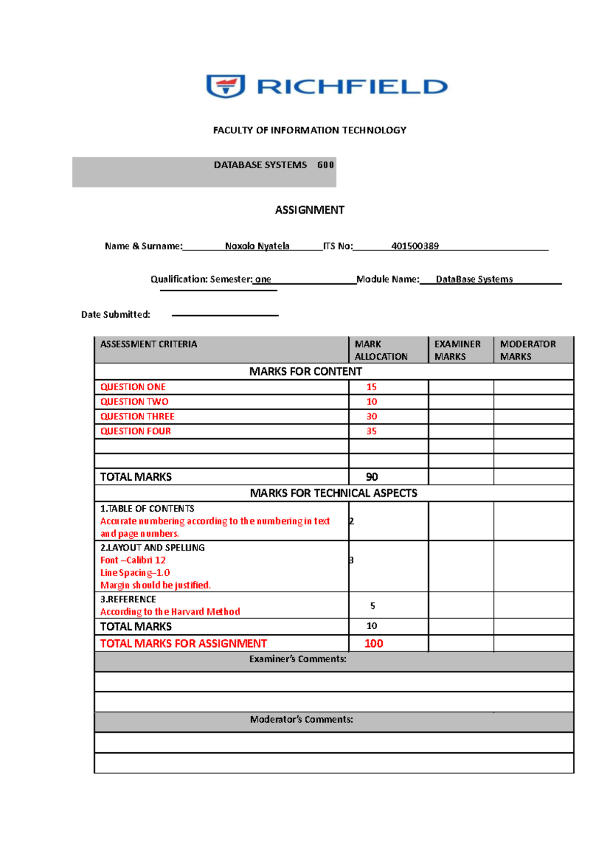 Database Systems 600 Assignment: Analysis and Insights - Studocu