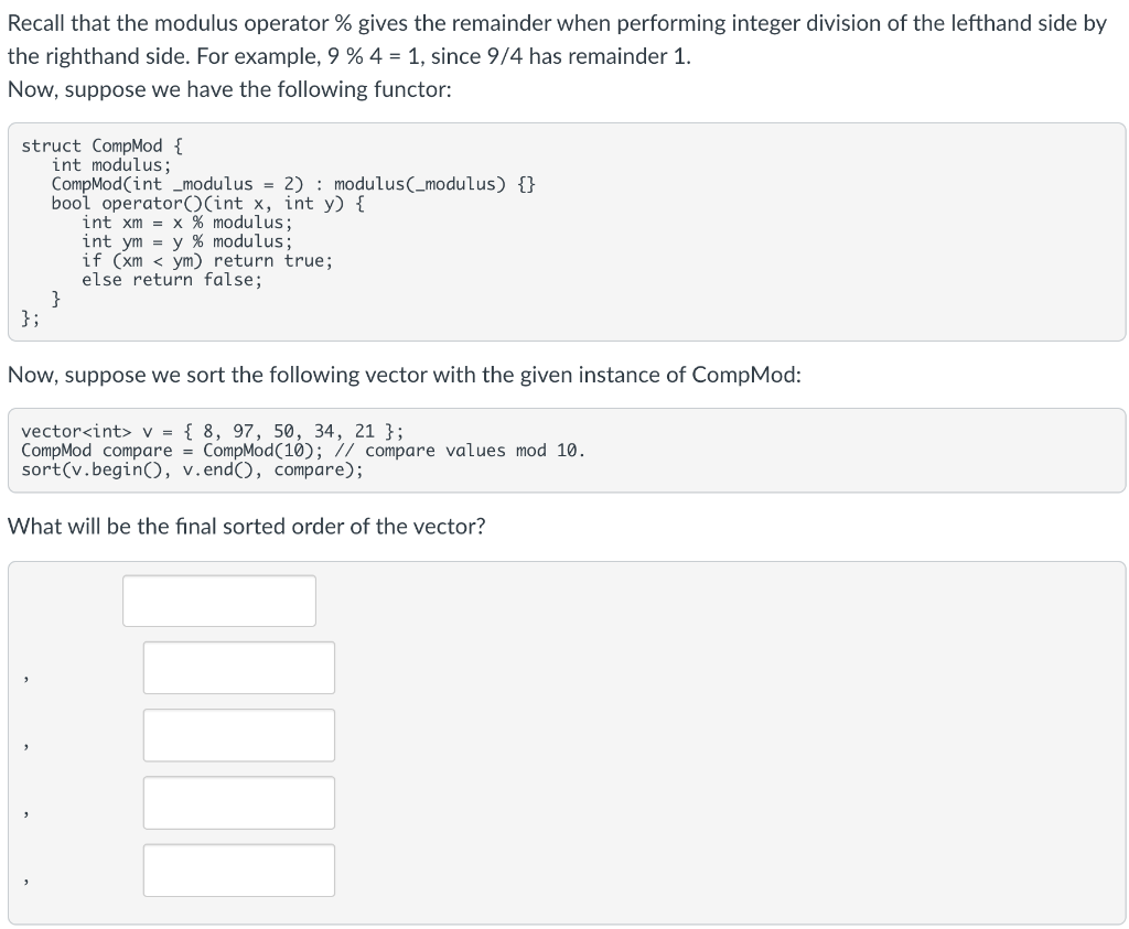 Solved Recall that the modulus operator % gives the | Chegg.com