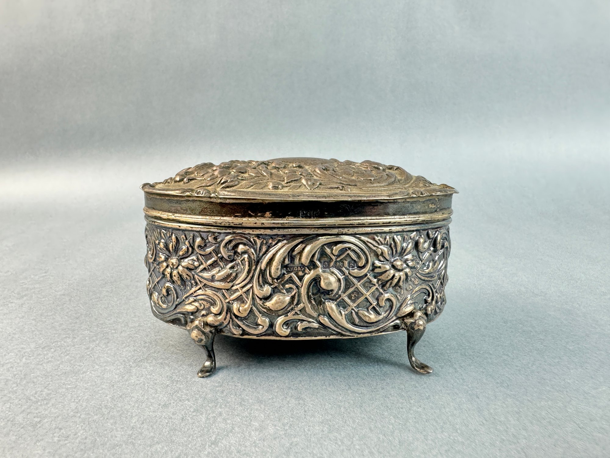 Birmingham silver oval trinket box with hinged cover on low ball ...