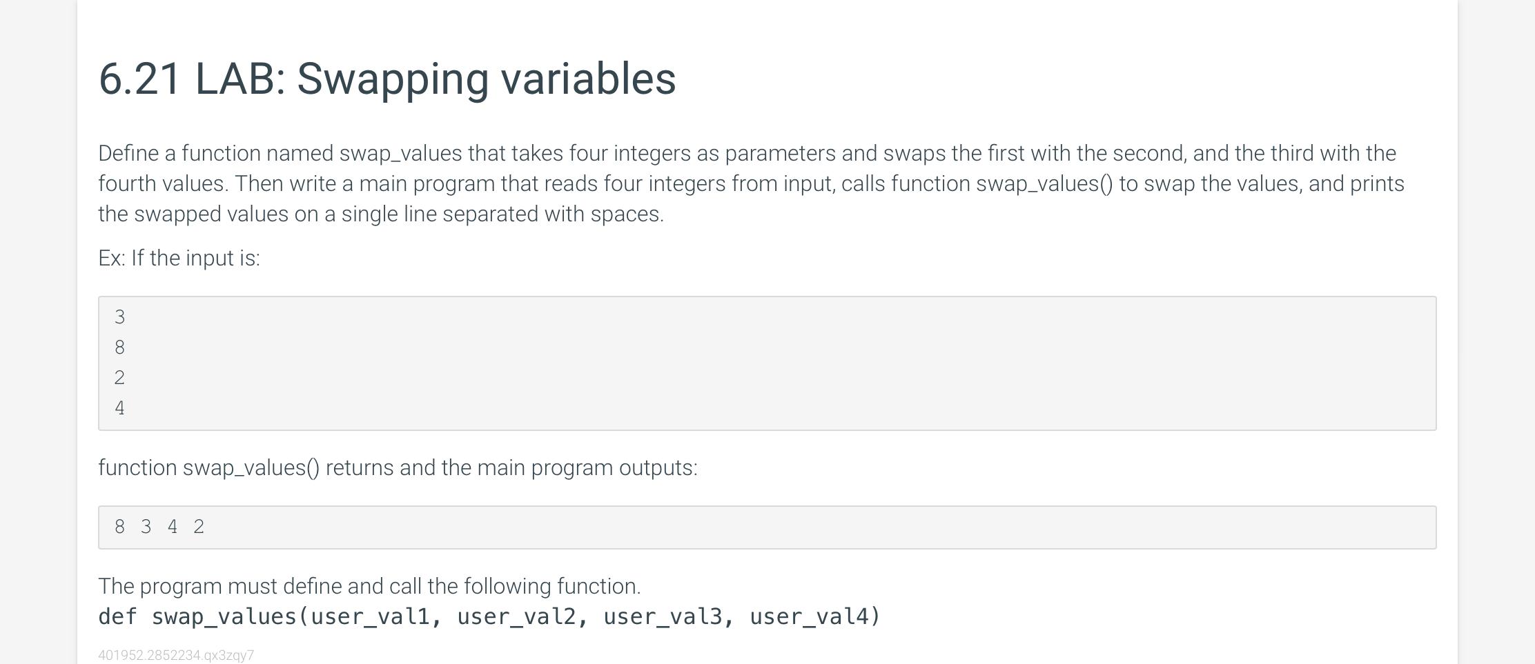 5.18 LAB: Swapping Variables with Function Implementation - Studocu