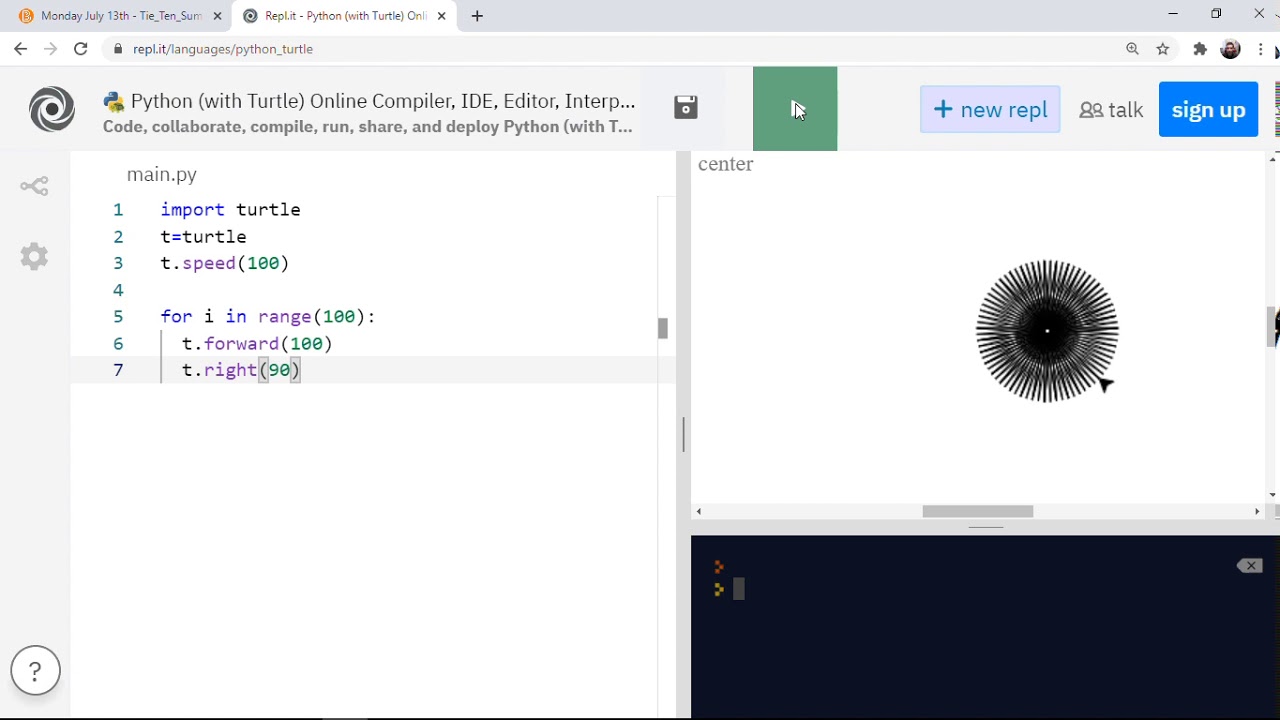 Square Spiral using Python's Turtle code to draw a square spiral design ...