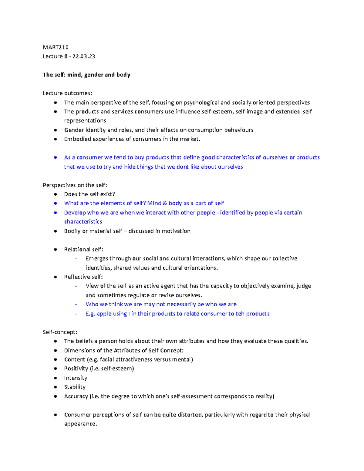 MART210 - Lecture 8 Notes - MART Lecture 8 - 22. The self: mind, gender ...
