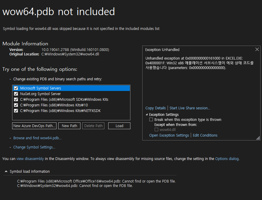 How to debug the "wow64.pdb is not loaded" error during DLL project ...